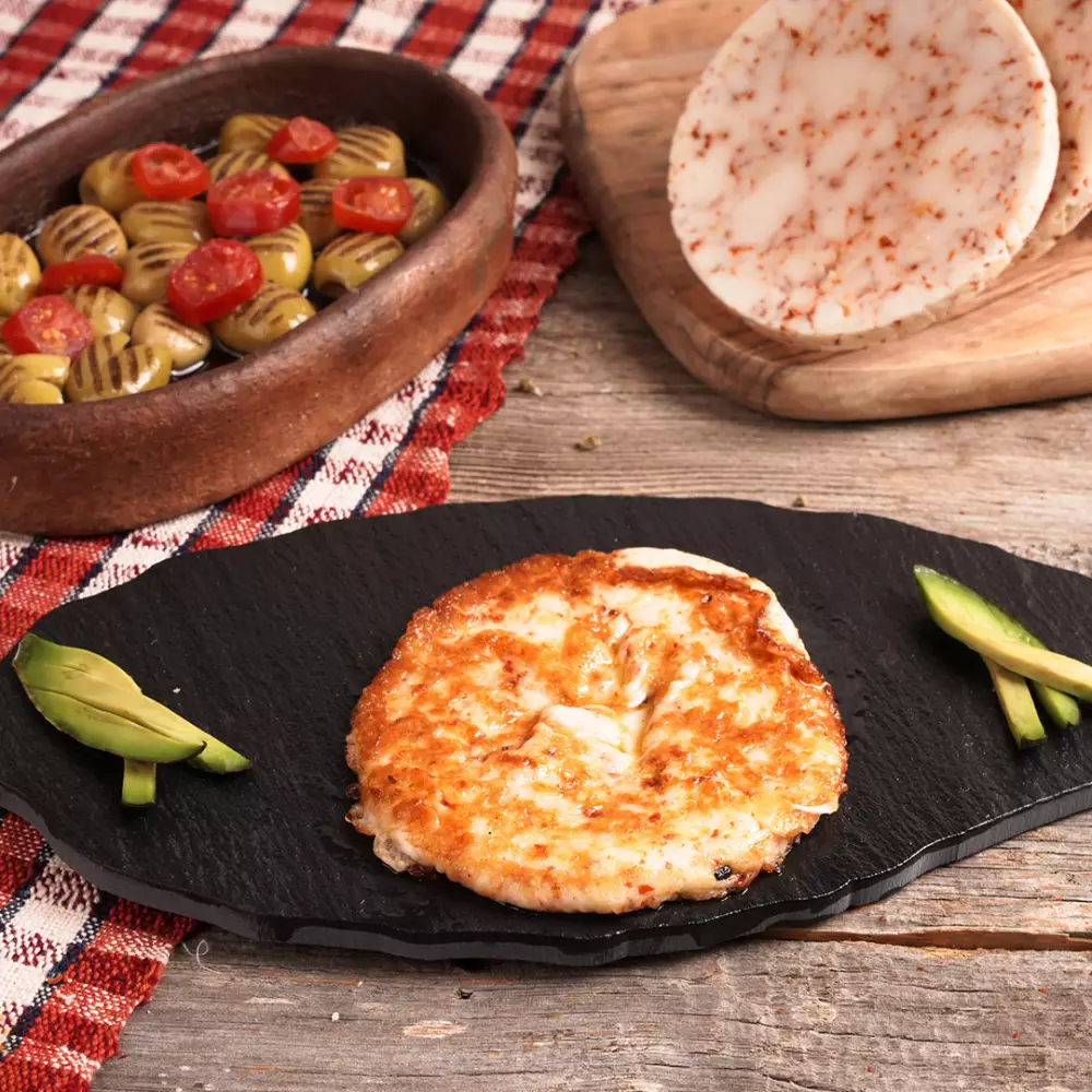Şık Süt Pul Biberli Saganaki Peyniri, kızartıldığında mükemmel kıvam alan yapısı ve pul biberin hafif acılığıyla sofralarınıza yepyeni bir tat katıyor. Geleneksel Saganaki kültürünü modern bir dokunuşla sunan bu özel peynir, yüksek ısıya dayanıklı dokusuyla pişirme sırasında formunu korur ve eşsiz bir çıtırlık kazanır.